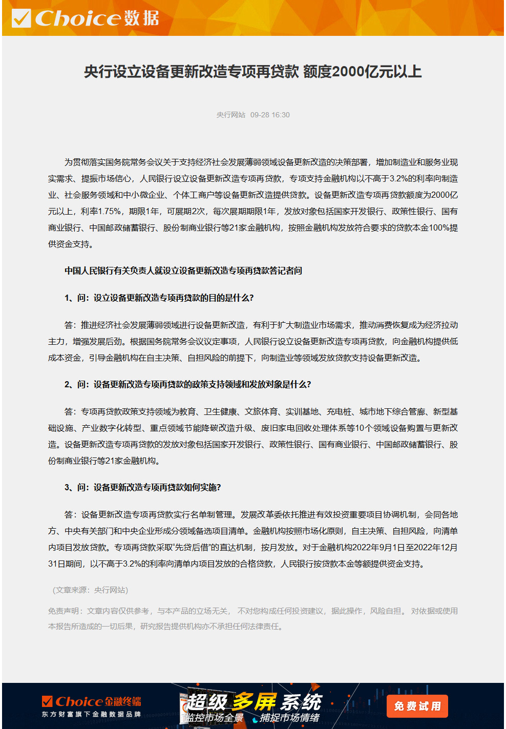 9月28日,根據(jù)中國(guó)人民銀行網(wǎng)站信息,為貫徹落實(shí)國(guó)務(wù)院常務(wù)會(huì)議關(guān)于支持經(jīng)濟(jì)社會(huì)發(fā)展薄弱領(lǐng)域設(shè)備更新改造的決策部署,增加制造業(yè)和服務(wù)業(yè)現(xiàn)實(shí)需求、提振市場(chǎng)信心,人民銀行設(shè)立設(shè)備更新改造專項(xiàng)再貸款,專項(xiàng)支持金融機(jī)構(gòu)以不高于3.2%的利率向制造業(yè)、社會(huì)服務(wù)領(lǐng)域和中小微企業(yè)、個(gè)體工商戶等設(shè)備更新改造提供貸款。設(shè)備更新改造專項(xiàng)再貸款額度為2000億元以上,利率1.75%,期限1年,可展期2次,每次展期期限1年,發(fā)放對(duì)象包括國(guó)家開(kāi)發(fā)銀行、政策性銀行、國(guó)有商業(yè)銀行、中國(guó)郵政儲(chǔ)蓄銀行、股份制商業(yè)銀行等21家金融機(jī)構(gòu),按照金融機(jī)構(gòu)發(fā)放符合要求的貸款本金100%提供資金支持。