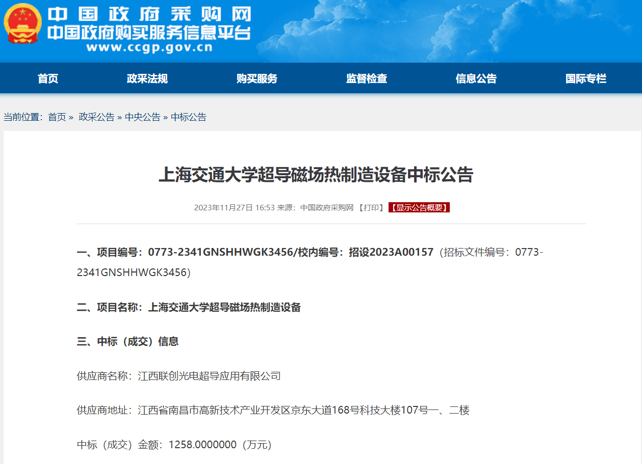 2023年11月27日,聯(lián)創(chuàng)超導(dǎo)憑借領(lǐng)先的技術(shù)優(yōu)勢、良好的信譽(yù)以及豐富的項(xiàng)目經(jīng)驗(yàn),贏得了評標(biāo)委員會和上海交通大學(xué)領(lǐng)導(dǎo)的肯定,順利中標(biāo)“上海交通大學(xué)超導(dǎo)磁場熱制造設(shè)備項(xiàng)目”,項(xiàng)目金額1258萬元。