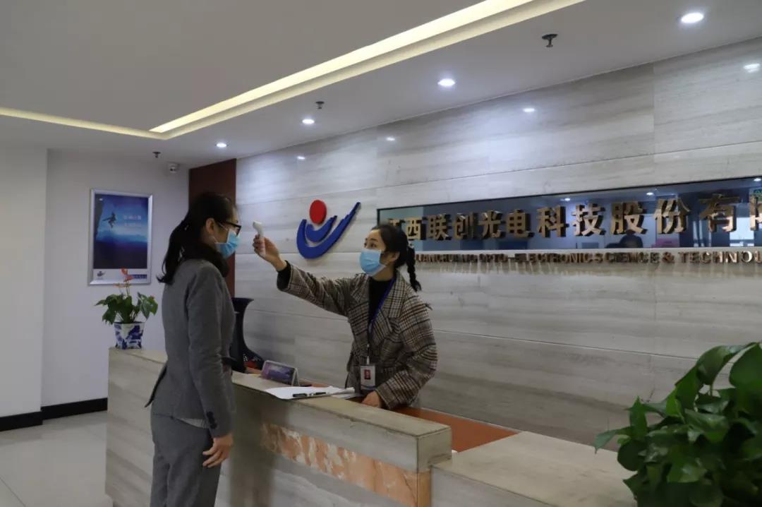 聯(lián)創(chuàng)光電科技園區(qū)實(shí)施封閉式管理,人員及車(chē)輛需憑核發(fā)的出入證進(jìn)出園區(qū)。園區(qū)東門(mén)崗和南門(mén)崗分別設(shè)立體溫檢測(cè)點(diǎn),對(duì)所有人員進(jìn)行實(shí)名制身份證查驗(yàn)、體溫測(cè)量和信息登記,堅(jiān)決杜絕體溫異常人員進(jìn)入園區(qū)和生產(chǎn)、公共辦公場(chǎng)所。
