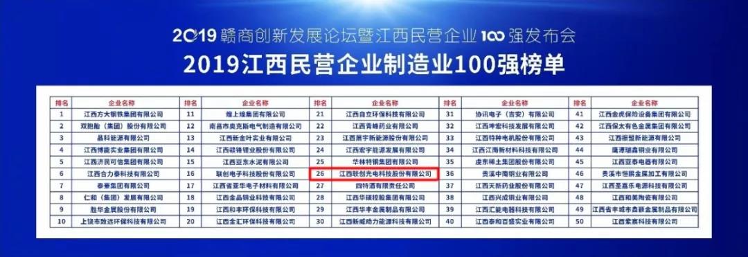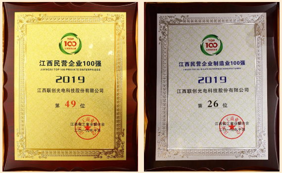 會上發(fā)布了2019江西民營企業(yè)100強、2019江西民營企業(yè)制造業(yè)100強名單,聯(lián)創(chuàng)光電均上榜,分別位列江西民營企業(yè)100強第49位、江西民營企業(yè)制造業(yè)100強第26位。聯(lián)創(chuàng)光電常務(wù)副總裁葉建青代表公司參會并領(lǐng)取獎牌。