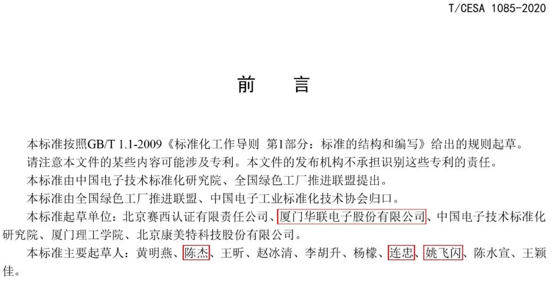 廈門華聯(lián)電子股份有限公司作為第二起草單位,參與起草了《家居智能控制器制造業(yè)綠色工廠評價要求》T/CESA 1085—2020。該標準起草單位有:北京賽西認證有限責任公司、廈門華聯(lián)電子股份有限公司、中國電子技術(shù)標準化研究院、廈門理工學院、北京康美特科技股份有限公司。