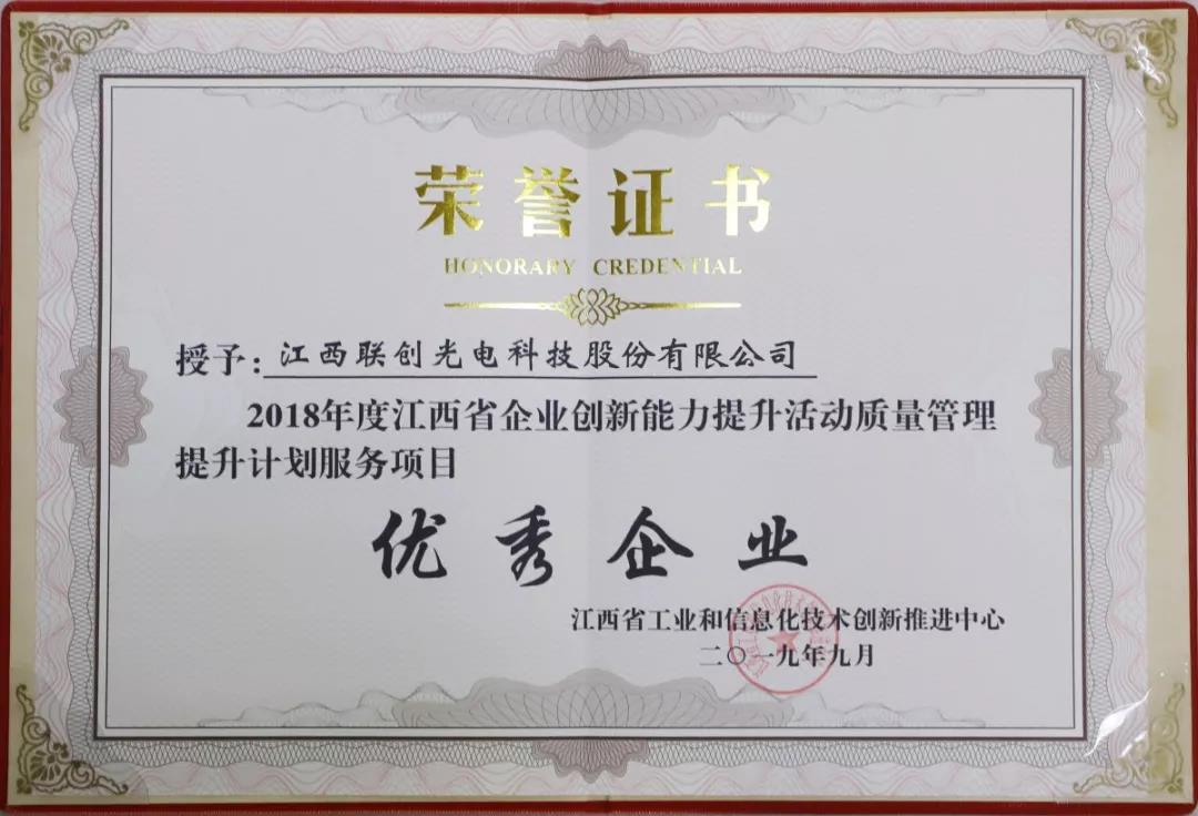 2018年,公司總部牽頭子公司——江西聯(lián)創(chuàng)致光科技有限公司共同參與2018年度企業(yè)創(chuàng)新能力提升活動。此次獲獎表明2018年公司在質量管理提升方面所獲得的經濟和社會效益得到了相關主管部門的認可和肯定。公司希望各子公司以此榮譽為激勵,對標先進,不斷深化推進質量管理(QC項目),促進各子公司的產品質量和管理水平不斷提高。