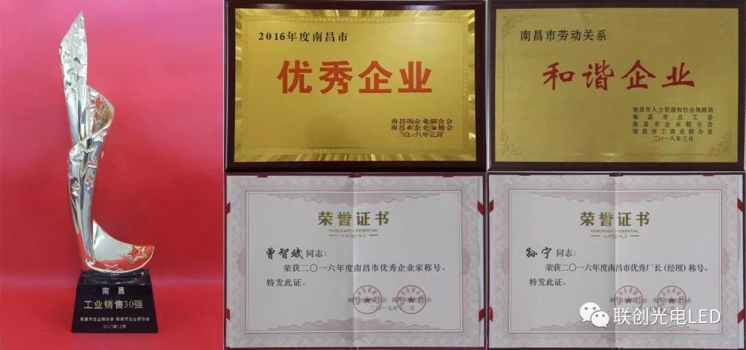 南昌市企業(yè)聯(lián)合會、企業(yè)家協(xié)會2017年年會暨表彰大會在紅谷灘會展中心召開,此次會議對一批工作業(yè)績突出的優(yōu)秀企業(yè)和先進個人進行了表彰。會上,聯(lián)創(chuàng)光電榮膺“2017年度南昌市工業(yè)企業(yè)銷售30強”、“2016年度南昌市優(yōu)秀企業(yè)”、“2016年度南昌市勞動關系和諧企業(yè)”榮譽稱號;股份公司董事長曾智斌榮獲“2016年度南昌市優(yōu)秀企業(yè)家”榮譽稱號;股份公司總裁孫寧榮獲“2016年度南昌市優(yōu)秀廠長(經理)”榮譽稱號。