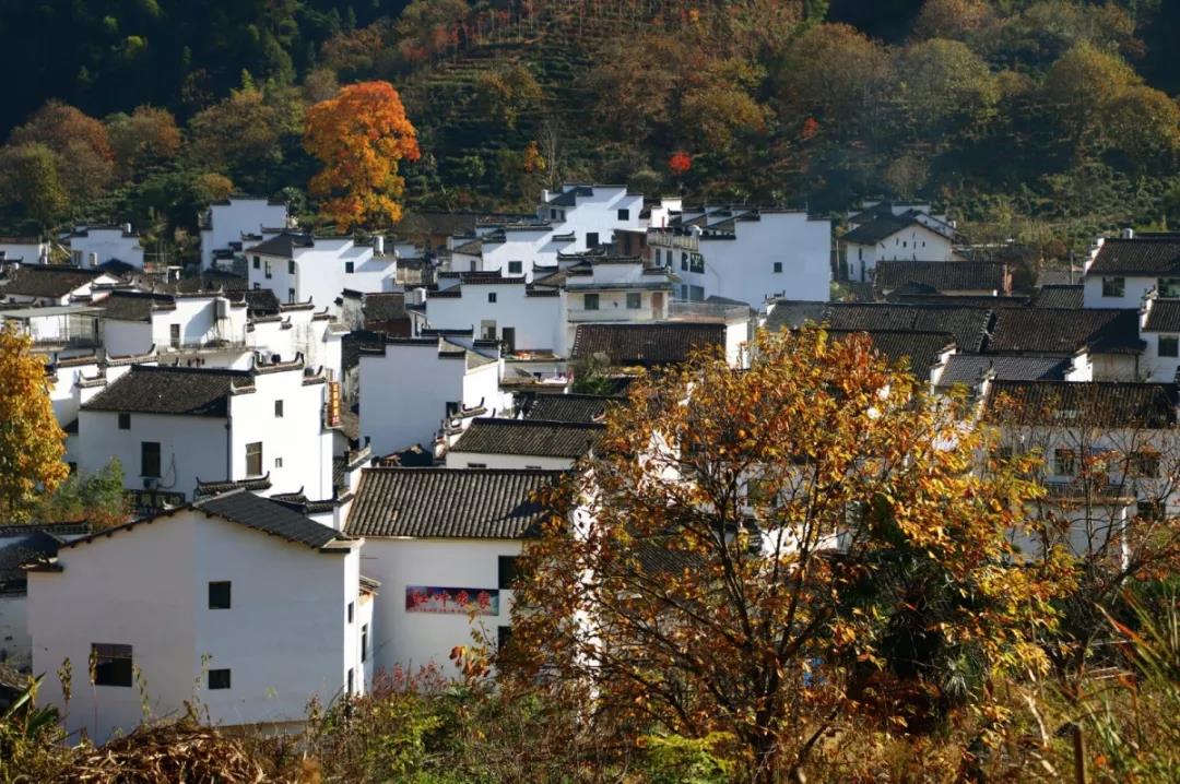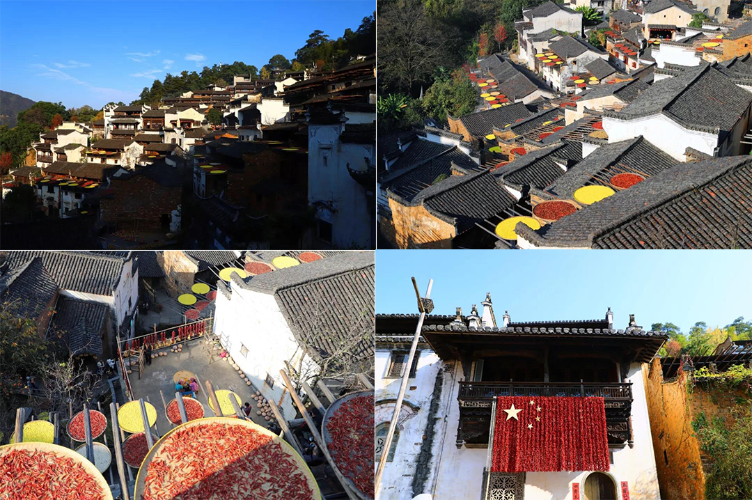 每當日出山頭,晨曦初照,整個山間村落間,那飽經(jīng)滄桑的徽式民宿的土磚外墻與長長木架上,圓圓的竹匾里五彩繽紛的豐收果實排列組合,繪就出“曬秋”農(nóng)俗景觀,甚是壯觀。